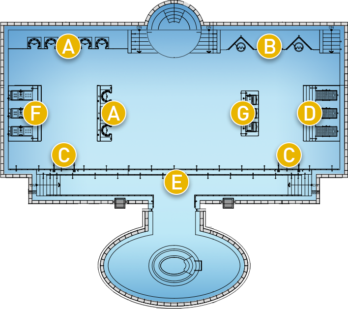 BODY SHOWER, FLOATING, NECK SHOWER, RELAX LINING, Walking Bath, DREAM BATH, BENCH JET 기능을 이용한 피부미용, 비만관리, 피로회복, 경추 통증 완화, 상지관절 통증 완화, 요통완화, 하지관절 통증 완화에 도움을 주는 물을 이용한 치료로 누적된 만성 피로와 스트레스를 풀어보세요.