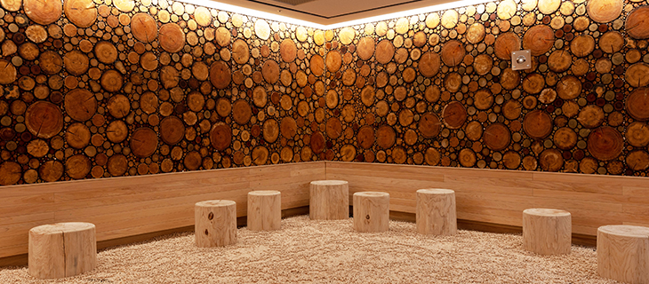 자연 숲속을 그대로 옮겨 놓은 듯한 네이처룸 벽면과 바닥에 있는 편백나무에는 살균작용, 삼림욕 등에 효과가 있는 피톤치드가 다량 방출되어 아토피성 피부염, 천식 환자 등에 도움이 되는 것으로 알려져 있으며, 정서 안정과 집중력, 기억력 향상과 함께 스트레스와 우울증, 불면증 개선에도 효과가 있다고 알려져 있습니다.